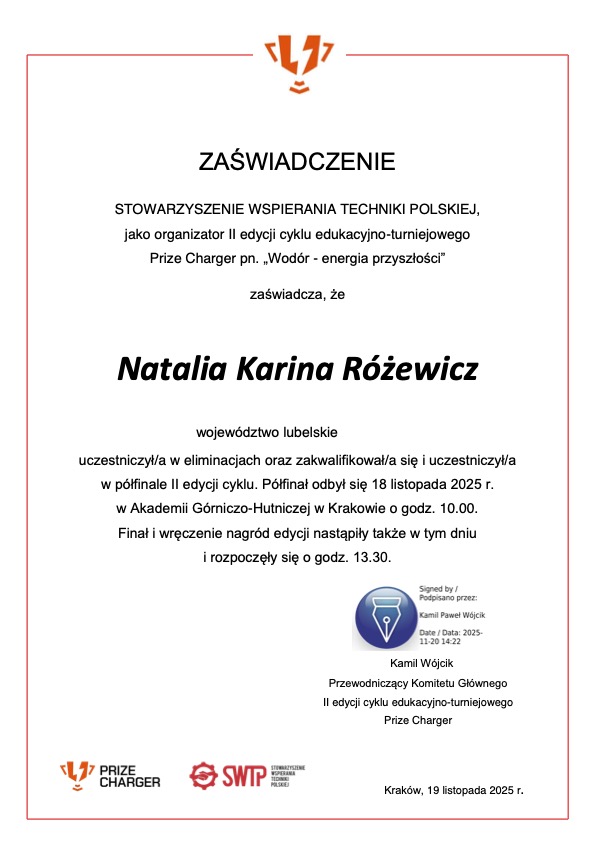 Naszym uczniom niewiele zabrakło do zdobycia tytułu laureata, jednak zostaną oni wpisani do rejestru finalistów Prize Charger, a ich dane mogą zostać udostępnione firmom poszukującym specjalistów z dziedziny energetyki wodorowej.